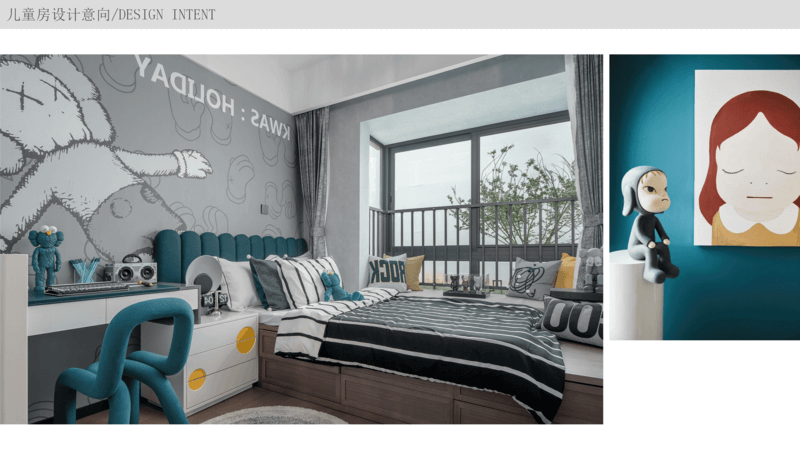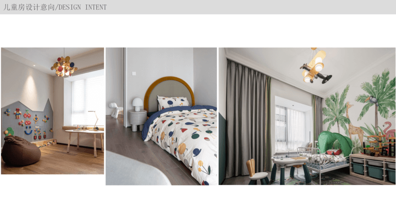 兒童房 主要以學(xué)習(xí)空間為主,用軟裝飾品來區(qū)分性別,如果業(yè)主孩子年紀(jì)較小也可以將這個房間當(dāng)做親子互動區(qū),小孩子都比較愛創(chuàng)造,那么可以設(shè)計(jì)一面黑板墻或者積木墻用來“亂涂亂畫”。