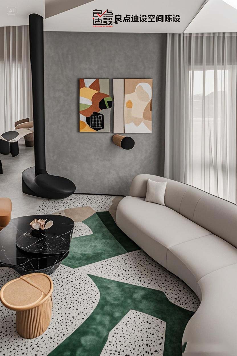 灰白客廳美到炸!弧形沙發(fā)+綠意地毯,這才是簡約天花板!
